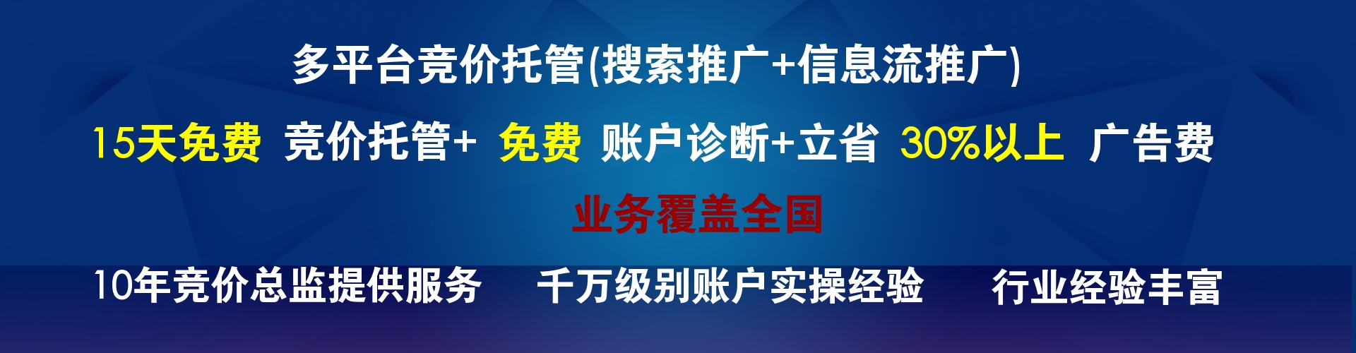 —【更省錢】招聘專員優(yōu)化,一年投入的工資+社保+培訓費用大約9萬人民幣,而且還不能保證賬戶優(yōu)化的效果。而托管相對費用更便宜,托管公司更專業(yè),效果能夠得到保障?;ǜ俚腻X獲得更多的咨詢。 —【更省力】術(shù)業(yè)有專攻,線上投放交給更專業(yè)的公司來做,企業(yè)自身才有更多的時間和精力來優(yōu)化產(chǎn)品和服務(wù)。真正的做到專業(yè)的人做專業(yè)的事,相對于招個競價員來說,省時省力更省錢。 —【提咨詢】相對于平臺客服和自己招專員優(yōu)化賬戶來說,我們能提供更好的優(yōu)化效果,保障花更少的錢獲得更多的咨詢。因為我們需要做的是長期留住客戶,必須靠實力靠數(shù)據(jù)說話。 —【更專業(yè)】我們的宗旨是節(jié)省消費,做出超出預期的投放效果。而且我們的賬戶管理員均有多年的競價管理經(jīng)驗,接觸過各行業(yè)百度競價賬戶,對競價規(guī)則、賬戶數(shù)據(jù)更加了解,優(yōu)化手法和思路更多、更廣、更專業(yè)。